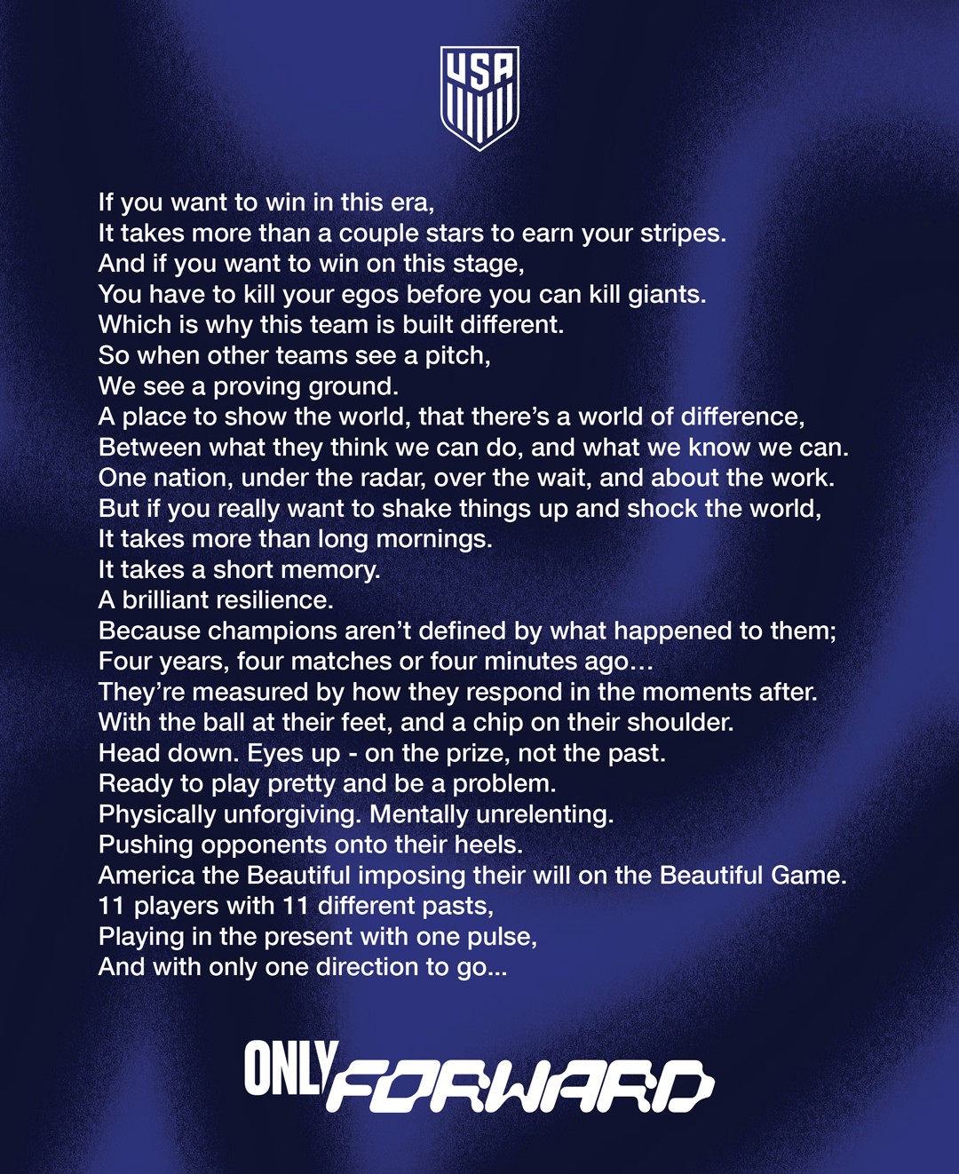 Ahead of the 2022 FIFA World Cup, ICNCLST developed Only Forward / Solo Pa’lante—a campaign for the USMNT that united fans and players around a shared, forward-looking journey. The platform carried through the entire World Cup cycle, culminating in the USMNT advancing to the knockout round in Qatar.