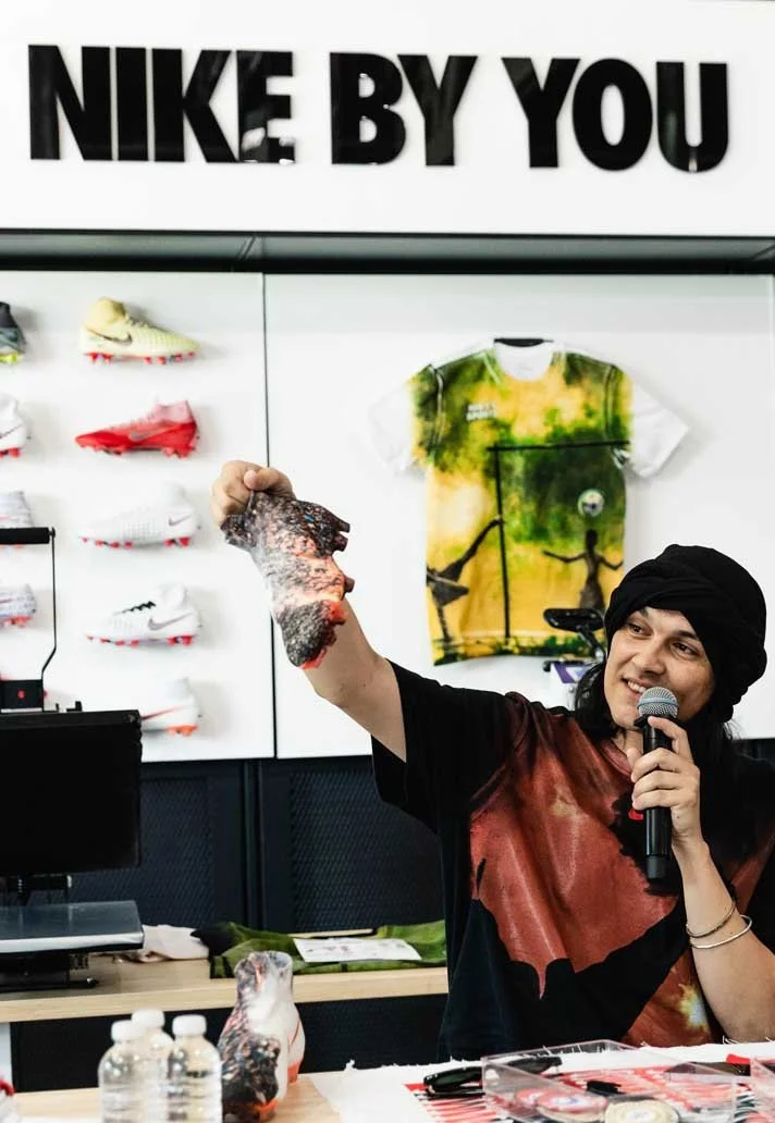 At the Nike By You Football Workshop in Los Angeles, Guillermo Andrade collaborated with Nike to design a bespoke Nike Mercurial Superfly 360 and one-of-one jerseys. The project aimed to fuse football culture with creative, personalized design.