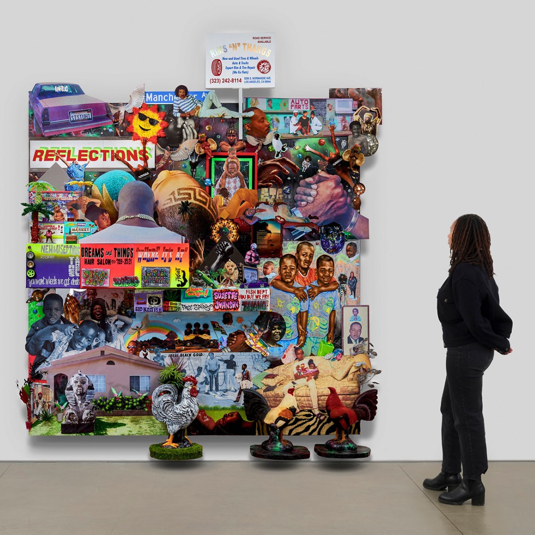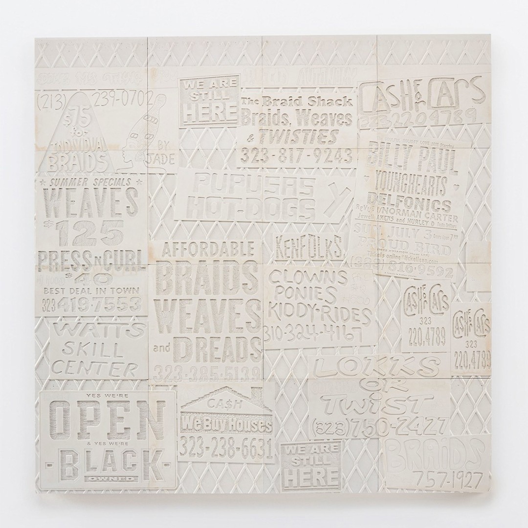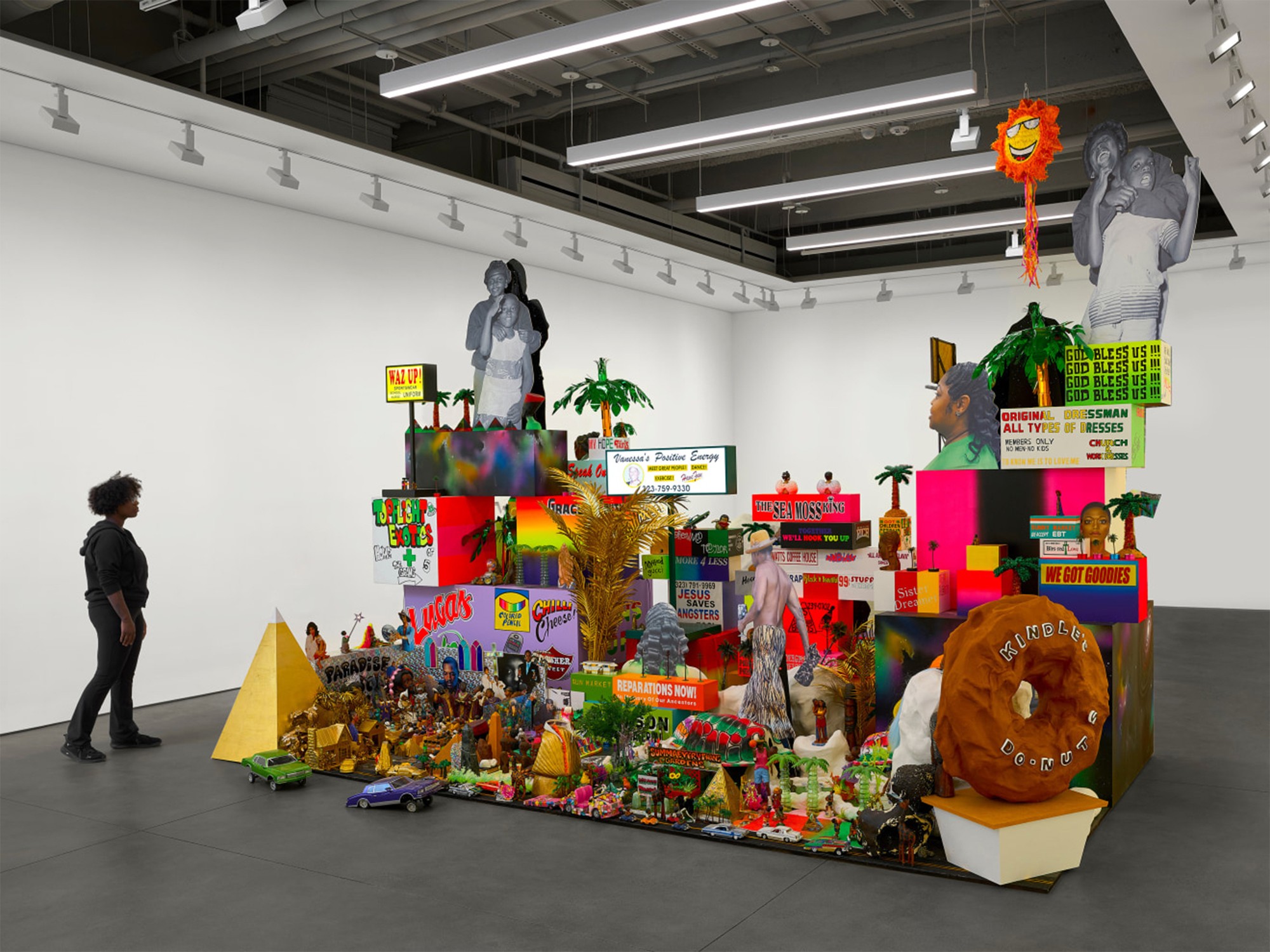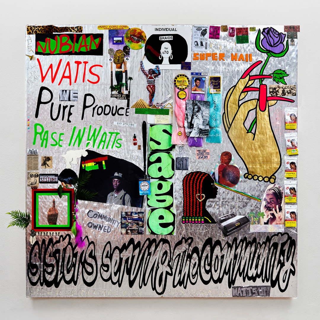 Los Angeles–based artist Lauren Halsey creates immersive installations and graphic collages that celebrate and archive Black cultural expression while resisting gentrification. Her work draws on local vernacular—flyers, murals, signage—and ancient Egyptian and Afrofuturist aesthetics, merging past, present, and speculative futures.