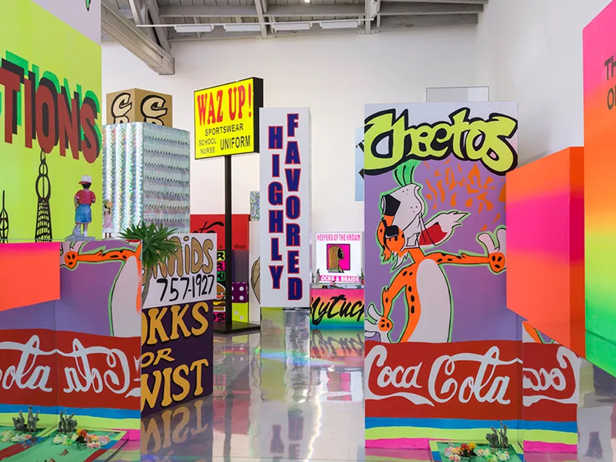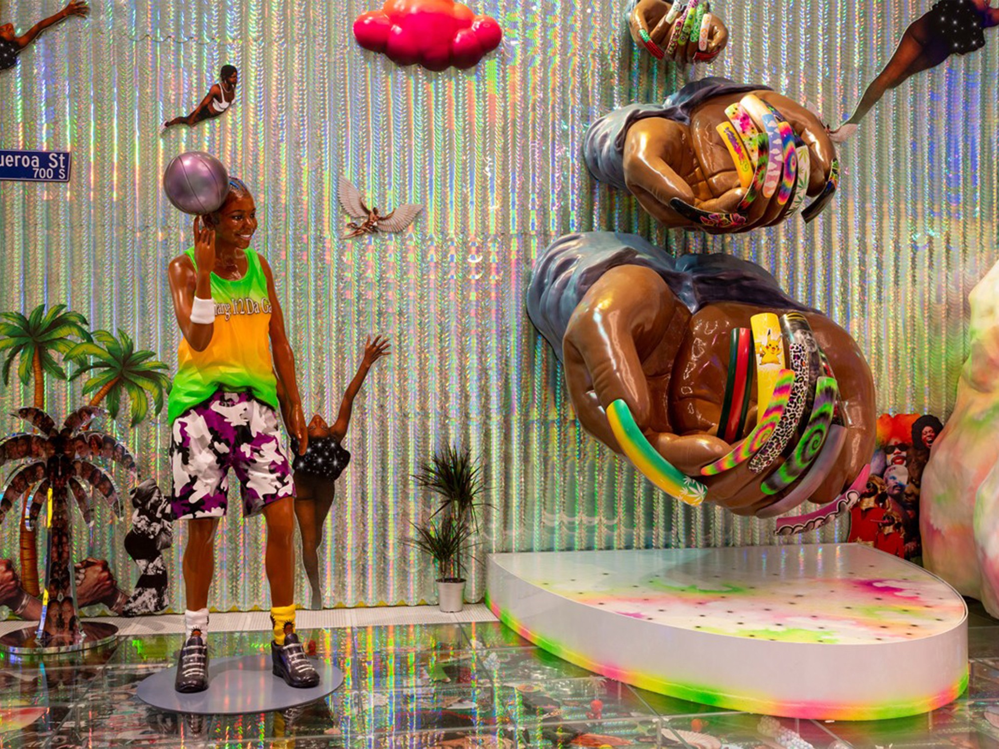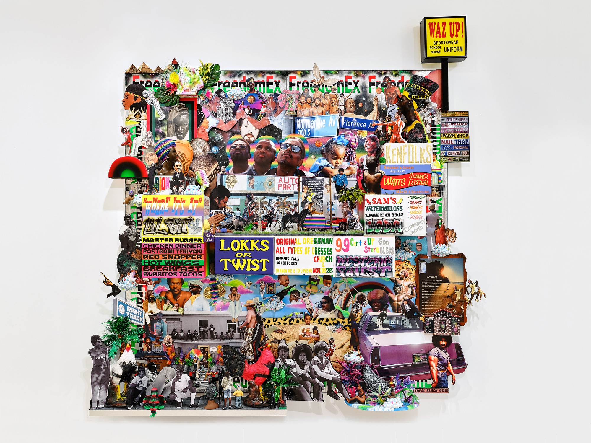 Los Angeles–based artist Lauren Halsey creates immersive installations and graphic collages that celebrate and archive Black cultural expression while resisting gentrification. Her work draws on local vernacular—flyers, murals, signage—and ancient Egyptian and Afrofuturist aesthetics, merging past, present, and speculative futures.